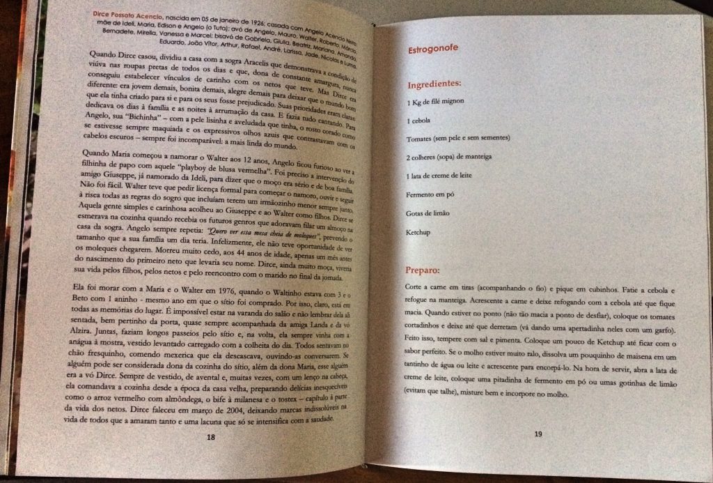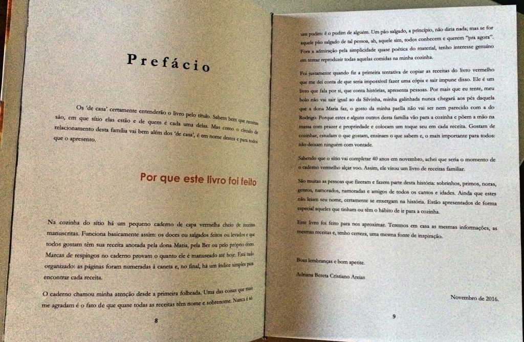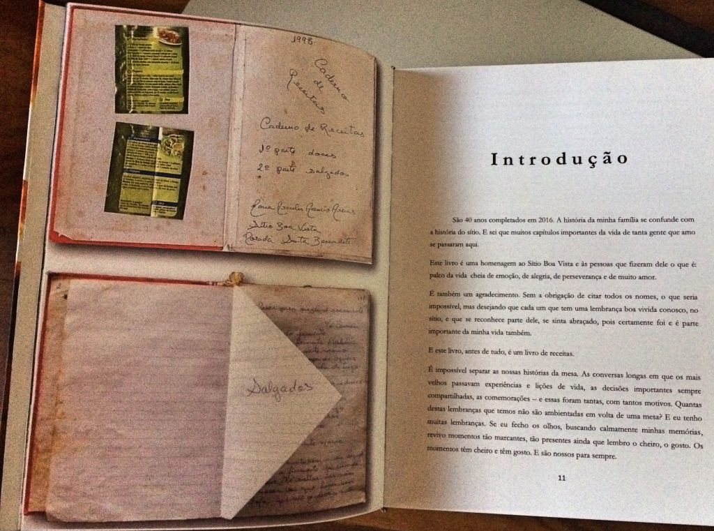 Há um pequeno caderno de receitas na cozinha do sítio da família. Ao longo dos anos, minha sogra foi registrando nele o que mais gostavam. Quando eu o abri pela primeira vez para copiar algumas, mudei o foco assim que o folheei: só conseguia pensar na quantidade de histórias por trás daquelas páginas marcadas pelos respingos, dobras, nomes, apelidos e sobrenomes em cada prato que estava lá. Decidi que faria dele um livro. Seria um livro de receitas com uma breve apresentação daqueles que tinham ou têm o hábito de ir para a cozinha naquele lugar especial. Fizemos um grupo com os “de casa” para resgatarmos a história, buscarmos informações, validarmos dados. Escrevemos, lemos e nos emocionamos juntos com passagens incríveis, fotos lindas, lembranças de todo tipo e, principalmente, com a esperança no que ainda está por vir. O livro “Receitas do Sítio” foi um presente aos meus sogros, Walter e Maria, em homenagem ao aniversário de 60 anos do Sítio Boa Vista. Foi feito em formato artístico, com material exclusivo e, portanto, em pequena quantidade. Gosto de pensar nele como uma bela introdução, um pontapé inicial para o que pode ser feito – porque, além da cozinha e do sítio, há uma história de vida que vale muito ser contada um dia.