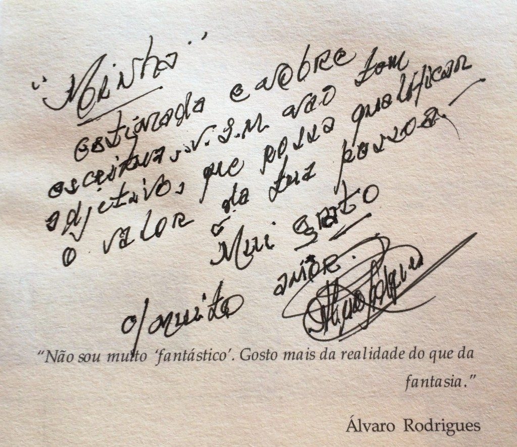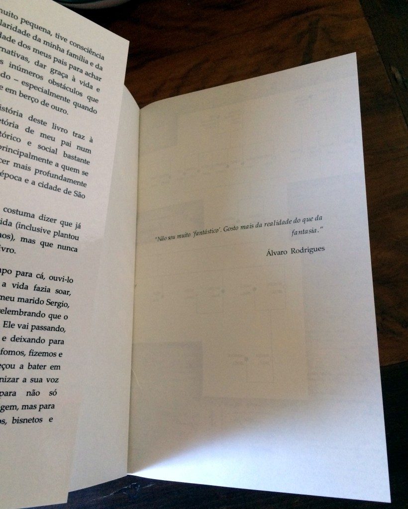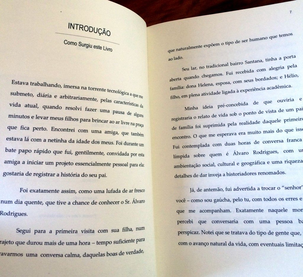 Este lindo livro foi idealizado por uma filha e seu marido para ser dado como presente de aniversário ao pai, sogro e amigo Álvaro Rodrigues. É importante salientar que, muito mais do que um trabalho prazeroso, este projeto me proporcionou conversas riquíssimas, grandes e novas amizades, momentos engraçados, outros tantos emocionantes e deliciosos cafés da tarde ao bom estilo português. Trata-se da biografia de um admirável paulistano, filho de imigrantes portugueses, nascido e criado em um dos bairros mais tradicionais de São Paulo, dono de uma trajetória bem diversificada marcada por histórias impagáveis. O livro totaliza 287 páginas, sendo 64 de fotos do acervo familiar.